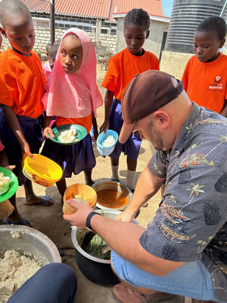 Особенно тяжело было видеть детей, которые росли в постоянной нехватке еды. Поэтому в 2017 году Денис начал кормить детей своими силами. Он сам покупал продукты и привозил их, а мадам Юнис, школьный учитель, готовила еду. Так началось служение, которое продолжается до сих пор.